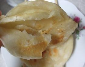 赶饼时注意稍微轻一点用力,否则层次会消失。入锅烙饼。见金黄色时可以盛出来。
