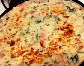 两杯面粉+切好的火腿+海苔+玉米粒+鸡蛋+盐+鸡精+牛奶
