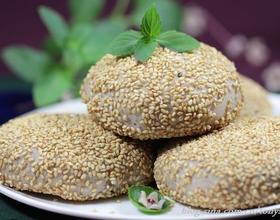 把面团分成一个个小剂子搓圆后放入铺满芝麻的容器里滚上芝麻;