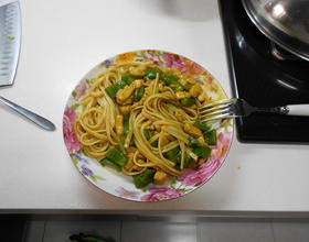 意面选择很重要,选择细圆棍意面,搭上白色的餐盘,就和西餐厅卖的意面差不多卖相了,要是用我这种骨瓷花盘,搭上筷子,那感觉,,就成了中式面条。哈哈,不管怎么说,味道好就行了。对了,不用鸡脯肉,用鸡腿肉切小丁也不错,鸡脯肉的口感不怎么样。另外配菜除了青椒外,还可以放入红萝卜丁、土豆块。我是只有青椒了,就只放了青椒,配菜可以根据自己口味来加~另外,没有咖喱块,用咖喱粉也行,但可能要上点水淀粉,要让汤汁浓稠这样才够味!!!