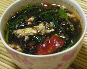 将紫菜煮二分钟,放入青菜叶少许,同时加入盐。