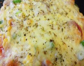 披萨配料:发好的面皮上浇上一层做好的番茄酱,放上洋葱片、青椒片、火香肠片、玉米粒,最后撒上奶酪入炉200℃、14分钟