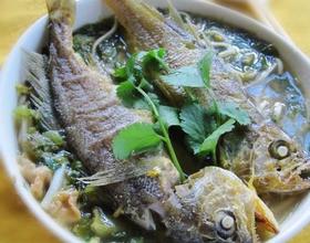 - 2. 捞出来的面条放在冷水下过凉(防止面条粘连并保持口感),小黄鱼用少许油煎至两面金黄成熟;另取一锅,放少许油,爆香姜丝,雪里蕻(锅太干的话,加少许水),接着再放入油渣和葱段,倒入热开水,调入盐,鸡精,美极鲜酱油,放入出好水的面条略煮即可,盛在面碗里,摆上煎好的小黄鱼,撒少许白胡椒粉增香~