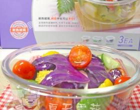 将所有原料洗净滤干水分,紫甘蓝、彩椒用手撕成小块,小西红柿切成两半,黄瓜切成滚刀块放入大碗内备用;