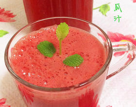 西瓜切两半,用勺子挖出,放入榨汁机中,并且将柠檬挤到榨汁机中,炸好汁后过筛即,放几片薄荷即可
