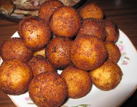 炸好的地瓜丸子,油有点热了,所以你做的时候,一定不要油太热再放进去。