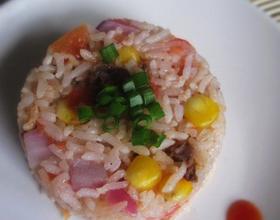 1、关于炒饭的要点具体可以点击前面的文章【臭豆腐炒饭】。里面有详细的说明。2、用适量的五香粉炝锅很香呦~番茄酱不仅使炒饭颜色上更好看,而且整体的番茄味会更加的浓郁。番茄酱可以适量多放点。3、玉米粒我用的是家里之前煮好吃剩的玉米剥下来的,如果是生的记得事先焯熟。如果觉得麻烦可以不放。但是建议洋葱最好加一点,味道会更好,实在不能接受洋葱的,可以换成青椒味道也很好。4、生抽加一点点提鲜就好,没有生抽也不要用老抽代替,颜色不好,可以换成鸡精。