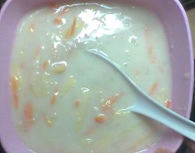 将燕麦片、胡萝卜丝、牛奶倒入锅内,再加一点水,喜欢吃稀粥的朋友可以多加点水,但是建议不要加太多,用文火煮。