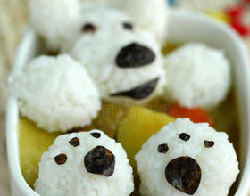 再将海苔剪出小狗鼻子形状,贴在小狗的鼻子部位。把海苔剪成嘴唇形状,安在嘴巴部位成为小狗的嘴巴。