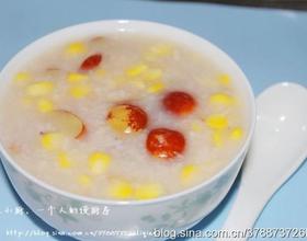 转小火煲至米完全开花加入洗净切去核的枣及玉米粒重新烧开即可。