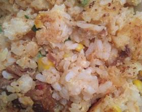 油加热,放入搅拌好的米饭,抄其成熟加入煮熟的玉米粒、青豆、胡萝卜,鸭肠,蒜蓉辣酱翻炒