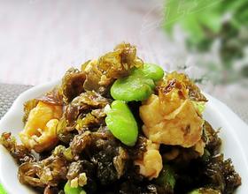 5·倒入蚕豆翻炒均匀加盐和糖调味。