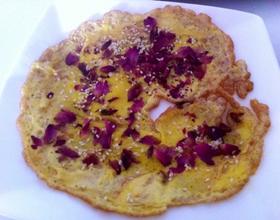 蛋饼煎的差不多时把玫瑰花瓣洒在上面