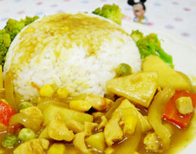 - 5. 将米饭倒扣在盘子上,上面淋上少许汤汁;再将咖喱鸡肉盛入盘中,周边配上几朵焯过水的西兰花。咖喱是由多种香料调配而成的酱料,常见于印度菜、泰国菜等,一般和肉类、米饭搭配烹调。由于咖喱中特殊的香料不仅能促进胃液分泌,令人胃口大增,而且同时能去除牛羊肉类的膻味,因而很受大家的喜爱,尤其是小孩子。一碗好吃又好看的咖喱鸡肉盖浇饭就这么做好了,简单易做你不要错过哦。