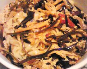 海带泡发后切丝、黄花菜洗净剪掉根部、干香菇泡发后切丝、黑木耳切丝、腐竹切段