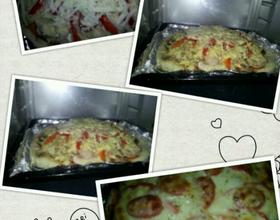 5.上配菜:将面饼放入烤盘中,先涂一层番茄酱或许披萨酱,铺一层马苏里拉芝士碎,将配菜铺入面饼上,中间稍薄一点,摆上红黄椒,圣女果,再撒厚厚一层芝士,自己吃芝士可以多放点,嘿嘿!最后,别忘了再撒点披萨草,别小看这这东西,很提味到的!