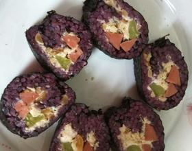 饭好后加入寿司醋尝一下大概有点酸味了不用放太多竹帘上记得铺上保鲜膜先然后放上寿司紫菜再加入各种料