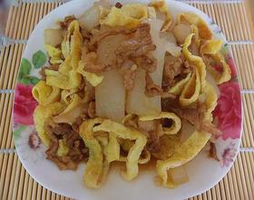 - 10. 汤汁浓稠厚,再把切丝的鸡蛋倒入,轻轻翻炒均匀,出锅。