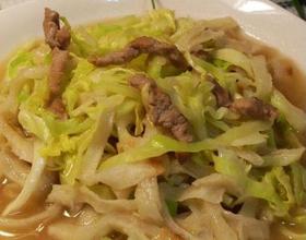 - 11. 下入圆白菜丝和肉丝翻炒几下,加盐、生抽、水,大火烧开。