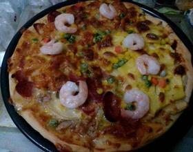 - 6. 烤箱预热后放入披萨,温度嘛,我觉得和自家烤箱有关,我看有用190度的,但是我家这个调到190加热管都不怎么红,无奈调到猛烤档,前后也得半个多小时,烤温和时间需要自己掌握,熟了就行最后十分钟时又在表面放了一圈虾仁