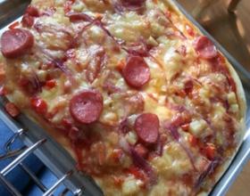 - 3. 面发好了赶成面皮,刷一层番茄酱,一层苏打奶酪,一层菜,在菜上面放青红椒圈,再在上面放香肠圈,再铺一层奶酪