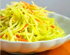 1、西芹丝切时要有耐心,尽量切得细些,如果切不好,可先用削皮刀削成薄片后再切就容易多了;2、胡萝卜是为了调颜色,让菜看起来漂亮些,没有的可不放,也可以放彩椒丝等;3、西芹丝用凉水泡这步骤不能省,泡后的西芹丝非常脆爽。