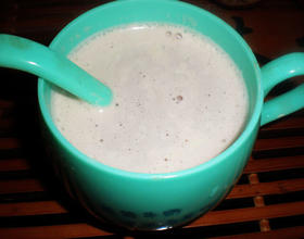 茶杯中装入奶粉,用少量的凉白开溶解。