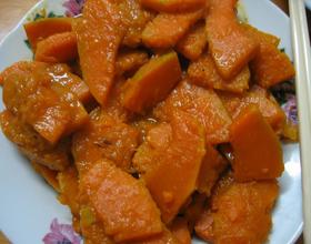把南瓜切薄片;放入锅内慢慢焖煮。不用放水。因为南瓜已经有很多水分的了。