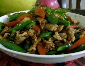 将猪肉切薄片,用盐、料酒、淀粉调和;青杭椒,胡萝卜片切成片。