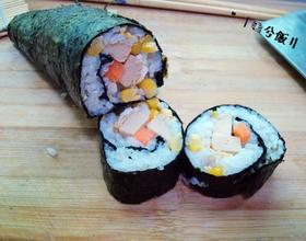 卷成卷的紫菜包饭,切的时候刀可以稍微沾点水,这样可以更好切。