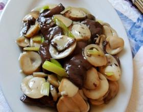 炒锅倒油爆香葱段和姜丝,倒入草菇翻炒至软;