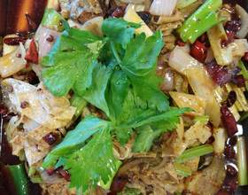 - 3. 然后锅里放厨师用的勺子两勺油放入姜片,大蒜,豆干,等油温起来后放入红油豆瓣,炒香,加半勺子水,最后放入配菜,加入调料煮一下就完工了