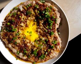然后外心可以铺你喜欢吃的东西,里面就把蛋黄铺上就行了,然后放蒸锅里面蒸五六分钟左右,