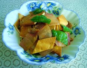 加青辣椒和香干片翻炒,加少许盐翻炒均匀