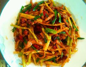 重放冷油(约炒菜的一半),小火放入辣椒段、花椒粒炒香后捞出留油,放入笋丝稍煸炒加盐翻勺匀加入肉丝、辣椒段、花椒粒、青蒜,加入少许生抽、红油翻匀出锅。