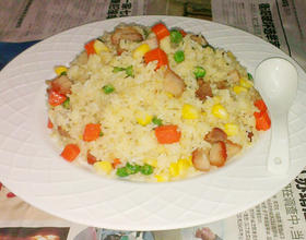 热锅,倒入花生油,倒入青豆萝卜玉米炒烧肉翻炒两分钟,再加入米饭翻炒,最后加盐起锅,再加一碟南瓜配菜