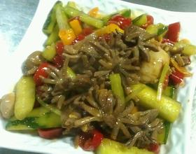 锅里留油,放黄瓜,鸡胗,泡椒,黄贡椒,蒜米,姜片,调盐,鸡精,味精,辣妹子,蚝油,老抽,白醋,各适量。勾芡出锅装盘。