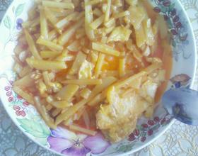 在锅里放中量油,炒土豆,后把鸡蛋放入