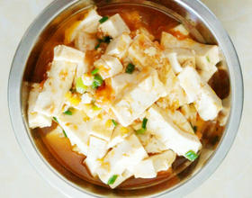蒜末炒香后放西红柿丁炒一分钟,再将豆腐放入一起炒,加盐,鸡精,香葱入味即可