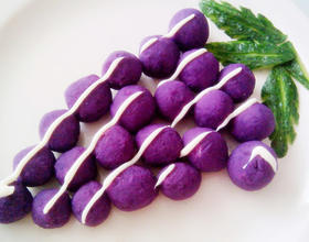 黄瓜,用小刀刻出叶子,摆好,再才上紫薯球,成葡萄串,挤上适量沙拉酱,