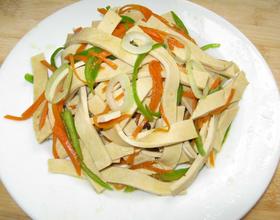 把锅里的菜倒入百叶上,加鸡精等拌匀。