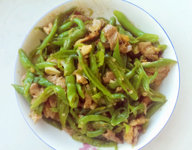 用余下油炒青椒,加适量盐等炒出辣味,将肉倒入混炒,加入几片蒜