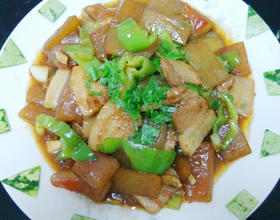 - 11. 加入青椒,醋少许继续翻炒几下。