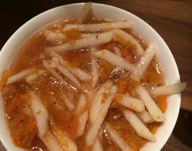 将冷藏好的山楂水倒在梨条上,再将糖桂花一同倒入,轻轻拌拌