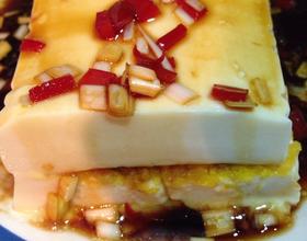 将豆腐横刀一分为二、将蛋黄均匀铺在豆腐上