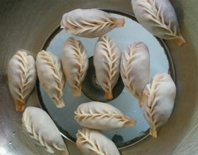 放适当的馅于面皮中间,用食指和大拇指打一个折,大拇指和食指各在面皮的一边,左右左右一个折,另一个大拇指调整馅,就好,