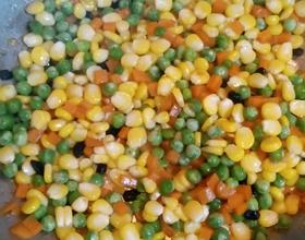 放入油烧热后倒入玉米粒和胡萝卜翻烧