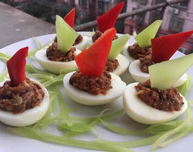 辣椒蒸熟后容易耷拉下来,影响帆船形象,各位亲们可以用牙签事先固定或是起锅后再摆造型