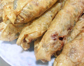 将油豆皮放在切菜板上,将搅拌好的肉肉放在油豆皮上
