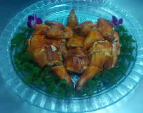 - 6. 待鸡身凉透后,用七成热的油将鸡的皮淋上色至金黄色便可。